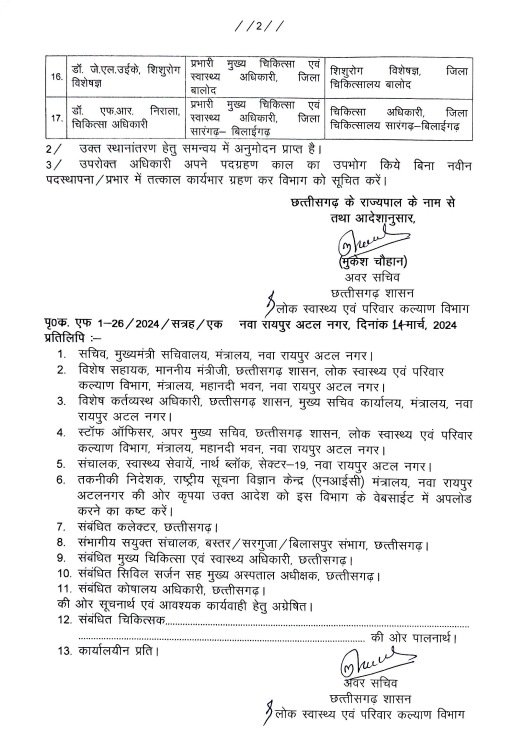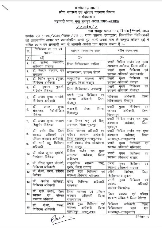 छत्तीसगढ़ में राज्य सरकार ने स्वास्थ्य विभाग में बड़े पैमाने पर तबादला किया है। सरकार ने प्रदेश के कई जिलों में सिविल सर्जन और सीएमएचओ को बदल दिया है। देखिए सूची