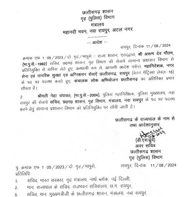 छत्तीसगढ़ में सरकार ने दो IPS अफसरों की नई पोस्टिंग आदेश जारी किया है। सरकार ने IPS अरुण देव गौतम की प्रतिनियुक्ति सचिव गृह विभाग की सेवाएं सामान्य प्रशासन विभाग से वापस लेकर उन्हें डीजी नगर सेना एवं नागरिक सुरक्षा एवं अग्निशमन सेवाएं छत्तीसगढ़ के पद पर पदस्थ किया है। सरकार ने उन्हें संचालक लोक अभियोजन छत्तीसगढ़ का अतिरिक्त प्रभार सौंपा है।