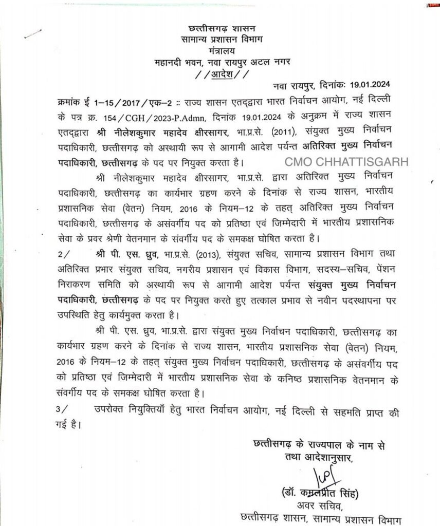 छत्तीसगढ़ में राज्य सरकार ने भारतीय प्रशासनिक सेवा के अधिकारियों की नई पदस्थापना आदेश जारी किया है। 2011 बैच के आईएएस अफसर नीलेशकुमार महादेव क्षीरसागर को राज्य सरकार ने अतिरिक्त मुख्य निर्वाचन पदाधिकारी के पद पर नियुक्त किया है। इससे पहले वे संयुक्त मुख्य निर्वाचन पदाधिकारी के पद पर पदस्थ थे। वहीं 2013 बैच के आईएएस अफसर पीएस ध्रुव को संयुक्त मुख्य निर्वाचन पदाधिकारी के पद पर पदस्थ किया गया है।