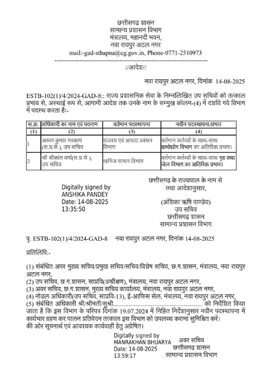 14/08/2025 Transfer Breaking: राज्य प्रशासनिक सेवा के अफसरों का तबादला, देखिए लिस्ट Admin September 26, 2022 छत्तीसगढ़ में राज्य सरकार ने राज्य प्रशासनिक सेवा के अफसरों का तबादला किया है।देखिए लिस्ट Related News: लोकसभा चुनाव से पहले दहलाने की साजिश नाकाम, एनकाउंटर में मारे गए 4 हार्डकोर नक्सली, 36 लाख रुपए था इनाम बलरामपुर में बड़ा सड़क हादसा: ब्रेक फेल होने से यात्री बस पलटी 25 लोग गंभीर रूप से घायल शहादत को नमन: केंद्रीय गृह मंत्री अमित शाह ने शहीद आकाश राव गिरिपुंजे के परिजनों से की मुलाकात