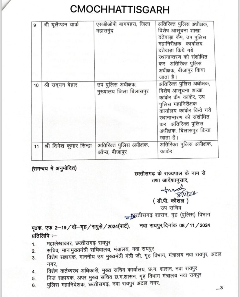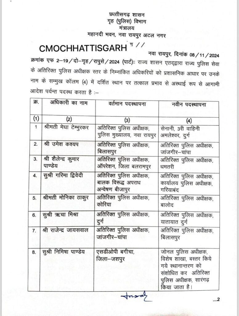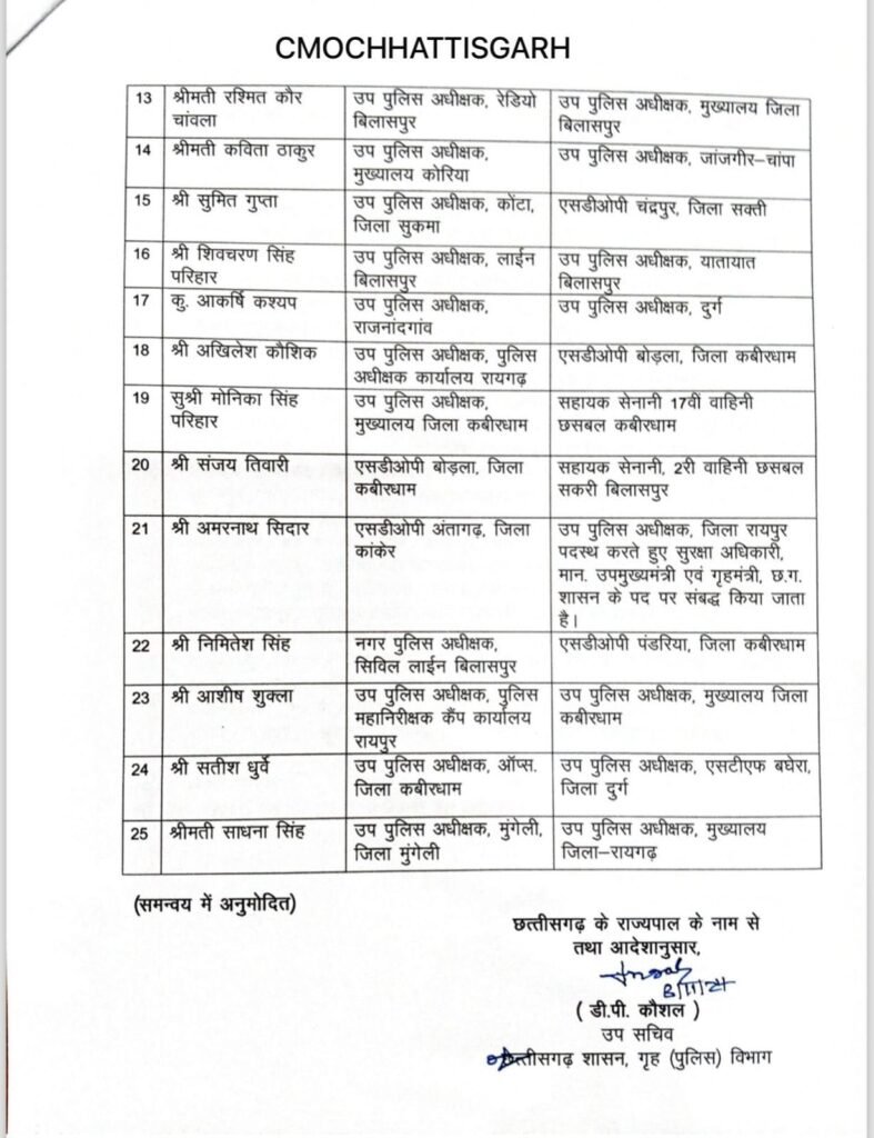 छत्तीसगढ़ में बढ़ते अपराधों के बीच सरकार ने पुलिस विभाग में बड़े पैमाने पर सर्जरी की है। सरकार ने एडिशनल एसपी और डीएसपी रैंक के कई अफसरों के तबादले किए है।