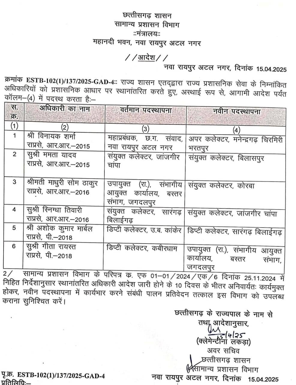 छत्तीसगढ़ में राज्य प्रशासनिक सेवा के अफसरों का तबादला किया गया है। राज्य सरकार ने आधा दर्जन अफसरों की नवीन पदस्थापना आदेश जारी किया है। संवाद में जीएम के पद पर पदस्थ विनायक शर्मा को एमसीबी जिला का अपर कलेक्टर की जिम्मेदारी दी गई है।