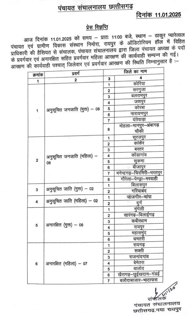 त्रि-स्तरीय पंचायत चुनाव: जिला पंचायत के अध्यक्षों का आरक्षण, 16 में आदिवासी होंगे अध्यक्ष, OBC के लिए कोई आरक्षित नहीं, रायपुर अनारक्षित मुक्त.. देखिए लिस्ट