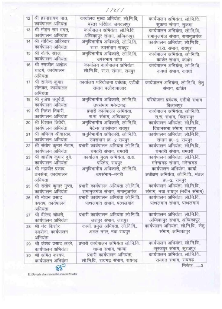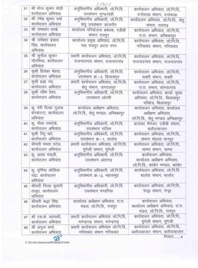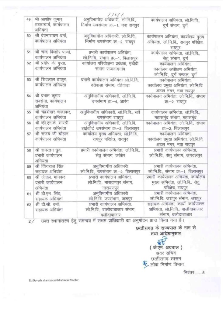 छत्तीसगढ़ में राज्य सरकार ने लोक निर्माण विभाग (PWD) में बड़े पैमाने पर तबादला किया है। लोक निर्माण विभाग में पदस्थ 62 कार्यपालन अभियंताओं के तबादला का आदेश जारी किया है।