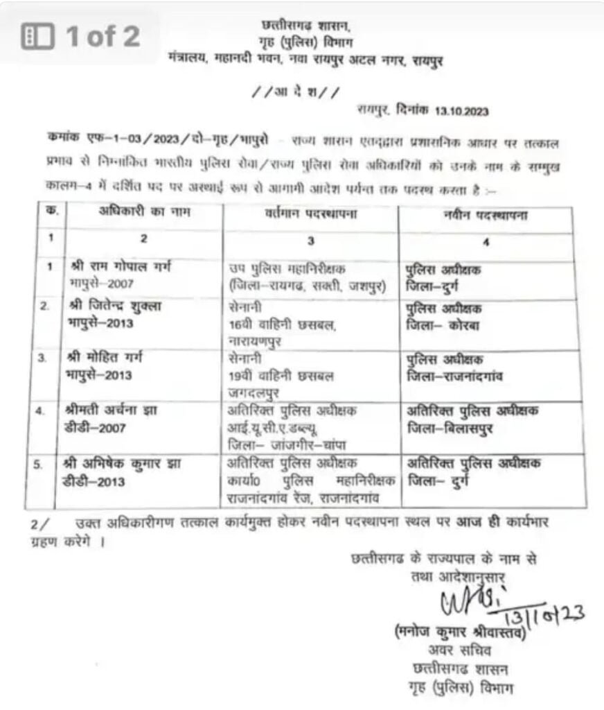 इसके साथ ही 3 आईपीएस अफसरों का भी तबादला हुआ है। इनमें रामगोपाल गर्ग को दुर्ग, जितेन्द्र शुक्ला को कोरबा और मोहित गर्ग को राजनांदगांव जिले के एसपी की कमान सौंपी गई है। वहीं अभिषेक झा को दुर्ग का एडिशनल एसपी और अर्चना झा को बिलासपुर एएसपी की जिम्मेदारी दी गई है।