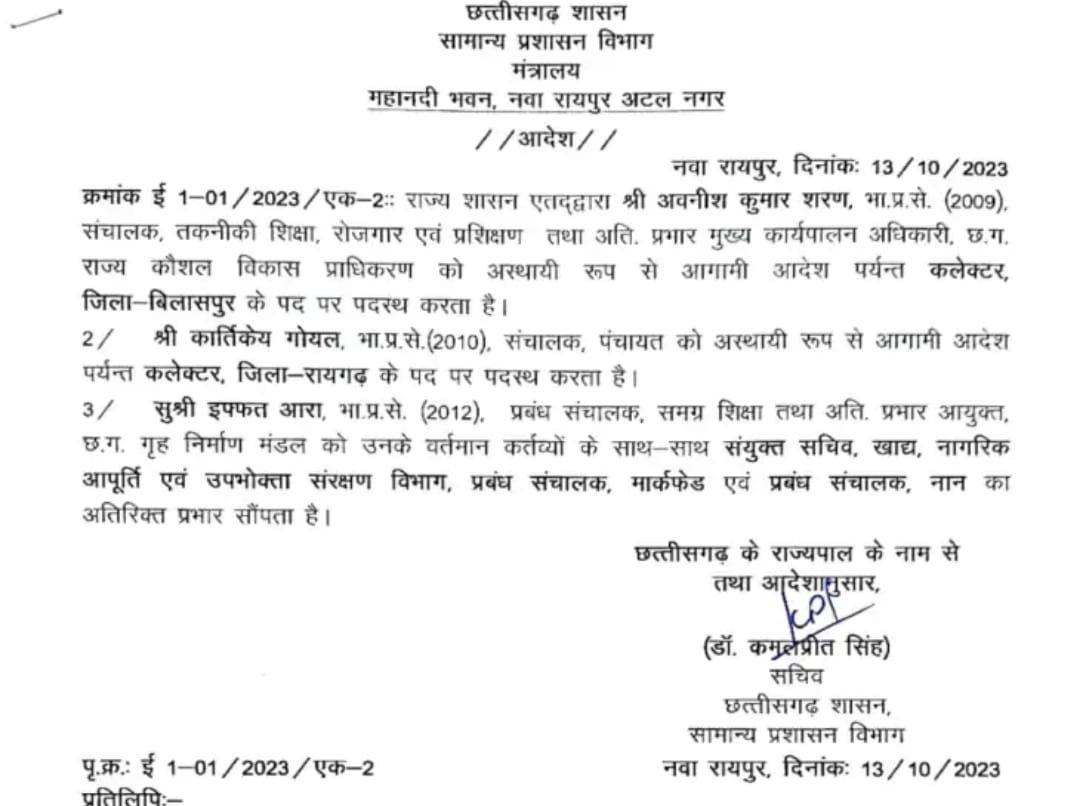 छत्तीसगढ़ में दो कलेक्टरों, 3 IPS अफसरों और 2 एडिशनल एसपी का तबादला हुआ है। सामान्य प्रशासन विभाग द्वारा जारी आदेश के मुताबिक अवनीश शरण को बिलासपुर और कार्तिकेय गोयल को रायगढ़ का कलेक्टर बनाया गया है। इसके साथ ही इफ्फत आरा को खाद्य नागरिक आपूर्ति विभाग के संयुक्त सचिव का अतिरिक्त प्रभार दिया गया है।