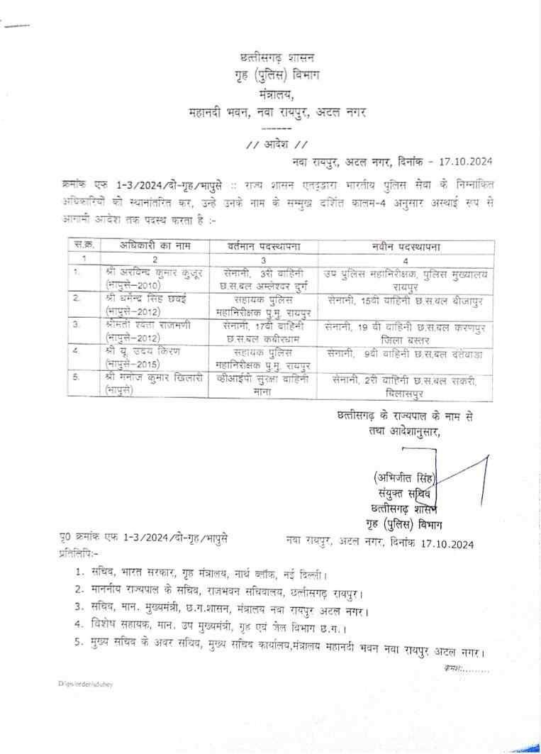 जारी आदेश के मुताबिक 2010 बैच के आईपीएस अरविंद कुमार कुजूर को सेनानी 3री वाहिनी अम्लेश्वर दुर्ग से उप पुलिस महानिरीक्षक पीएचक्यू रायपुर भेजा गया है। 2012 बैच के आईपीएस अफसर धर्मेंद्र सिंह छवई को सहायक पुलिस महानिरीक्षक पीएचक्यू से सेनानी 15वीं वाहिनी छस बल बीजापुर की जिम्मेदारी दी गई है।