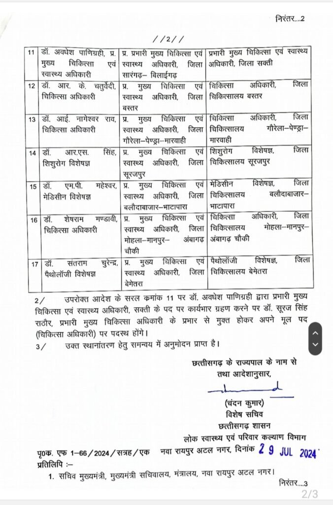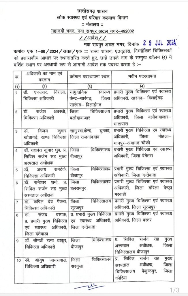 29/07/2024 Transfer Breaking: चिकित्सा अधिकारियों का तबादला, देखिए लिस्ट Admin September 26, 2022 छत्तीसगढ़ में राज्य सरकार ने चिकित्सा अधिकारियों का तबादला किया है। जिसमें कई प्रभारी मुख्य चिकित्सा अधिकारी भी शामिल हैं। Related News: Big Breaking: नंदकुमार साय कांग्रेस में हुए शामिल, CM भूपेश और मोहन मरकाम ने दिलाई सदस्यता ED Raid: छत्तीसगढ़ में CM के बेहद करीबियों के ठिकानों पर ED का छापा, भूपेश बघेल ने बताया बर्थडे गिफ्ट ट्रांसफर ब्रेकिंग: CG में अब इस विभाग में तबादले, देखिए सूची