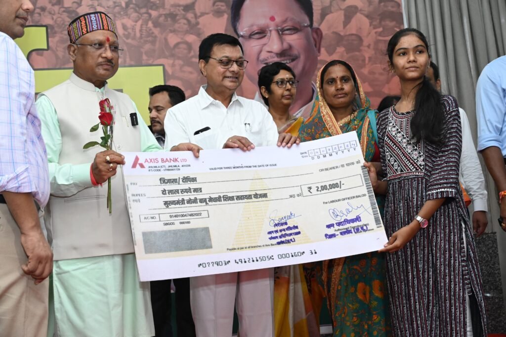 मुख्यमंत्री विष्णु देव ने आज मुख्यमंत्री निवास कार्यालय में आयोजित जनदर्शन कार्यक्रम से पूर्व पंजीकृत निर्माणी श्रमिकों के मेधावी बच्चों को नोनी-बाबू मेधावी शिक्षा सहायता योजना के अंतर्गत 26 लाख रूपए की सहायता राशि प्रदान करने के साथ ही उन्हें उच्च शिक्षा के लिए बधाई और शुभकामनाएं दी। कार्यक्रम में श्रम मंत्री श्री लखन लाल देवांगन मौजूद थे।