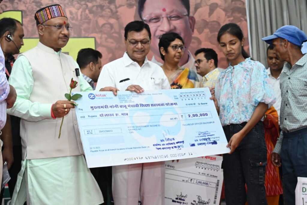 मुख्यमंत्री ने 10वीं और 12वीं की बोर्ड परीक्षा में टॉप 10 में स्थान अर्जित करने वाले पंजीकृत श्रमिकों के 13 मेधावी बच्चों को नोनी-बाबू मेधावी शिक्षा सहायता योजना के दो-दो लाख रुपए की सहायता राशि का चेक वितरित प्रदान किए। कार्यक्रम के प्रारंभ में मुख्यमंत्री श्री साय ने स्वामी विवेकानंद जी की पुण्यतिथि पर उनके चित्र पर पुष्प अर्पित कर उन्हें श्रद्धांजलि अर्पित की। मेधावी बच्चों को प्रदान किए गए दो-दो लाख रूपए की राशि में एक लाख रुपए प्रोत्साहन स्वरूप और एक लाख रूपए स्कूटी खरीदने के लिए दिए गए।
