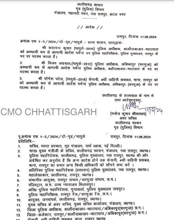 दीपक सोनी इससे पहले रजिस्ट्रार सहकारी संस्थाएं तथा अतिरिक्त प्रभार आयुक्त मनरेगा के पद पर पदस्थ थे। विजय अग्रवाल सरगुजा एसपी के पद पर पदस्थ थे। वहीं विजय अग्रवाल के स्थान पर सरकार ने छसबल 4थी वाहिनी में सेनानी के पद पर तैनात योगेश पटेल को भेजा है।