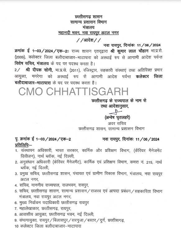 छत्तीसगढ़ के बलौदाबाजार जिले में हुई हिंसा के मामले में विष्णुदेव साय सरकार ने एक्शन लेते हुए जिला कलेक्टर केएल चौहान और एसपी सदानंद कुमार को हटा दिया है। सरकार ने चौहान के स्थान पर आईएएस अफसर दीपक सोनी और आईपीएस विजय अग्रवाल को बलौदाबाजार की कमान सौंपी है।
