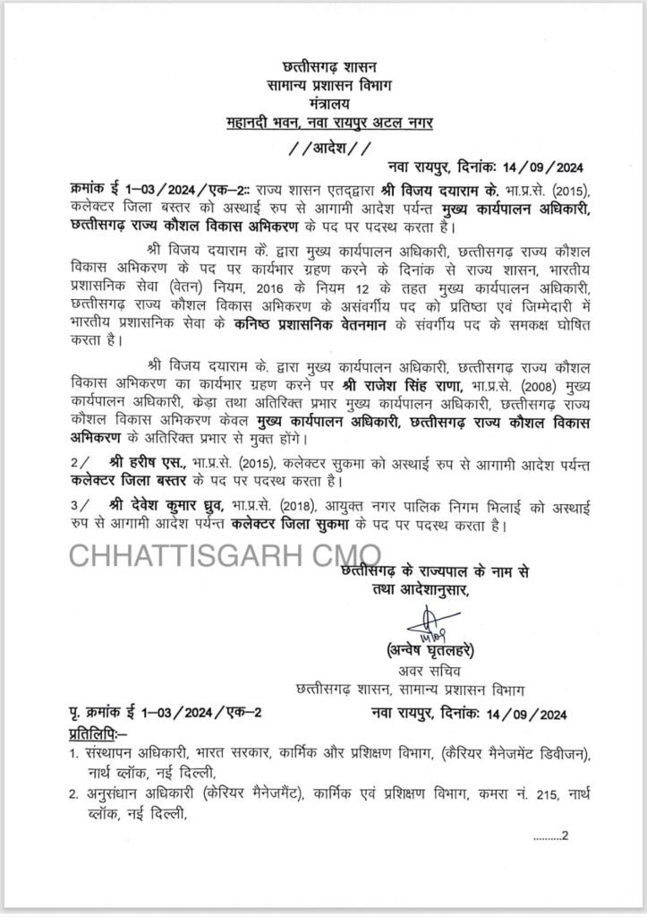 इसके साथ ही सरकार ने विजय दयाराम को छत्तीसगढ़ राज्य कौशल विकास अभिकरण के मुख्य कार्यपालन अधिकारी की जिम्मेदारी सौंपी है। आपको बता दें कलेक्टर-एसपी कॉन्फ्रेंस में बस्तर जिले की समीक्षा के दौरान सीएम ने असंतोष जताया था।