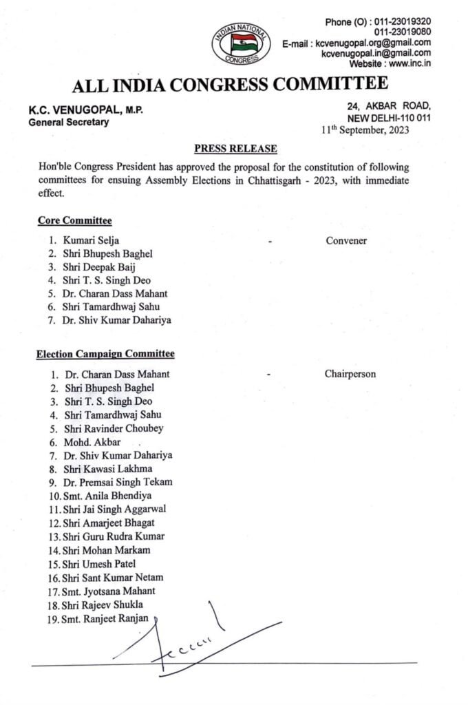 BREAKING: छत्तीसगढ़ विधानसभा चुनाव को लेकर कांग्रेस ने कमेटियों का किया ऐलान, CM और डिप्टी सीएम के साथ ही इन्हें भी मिली बड़ी जिम्मेदारी, देखिए सूची