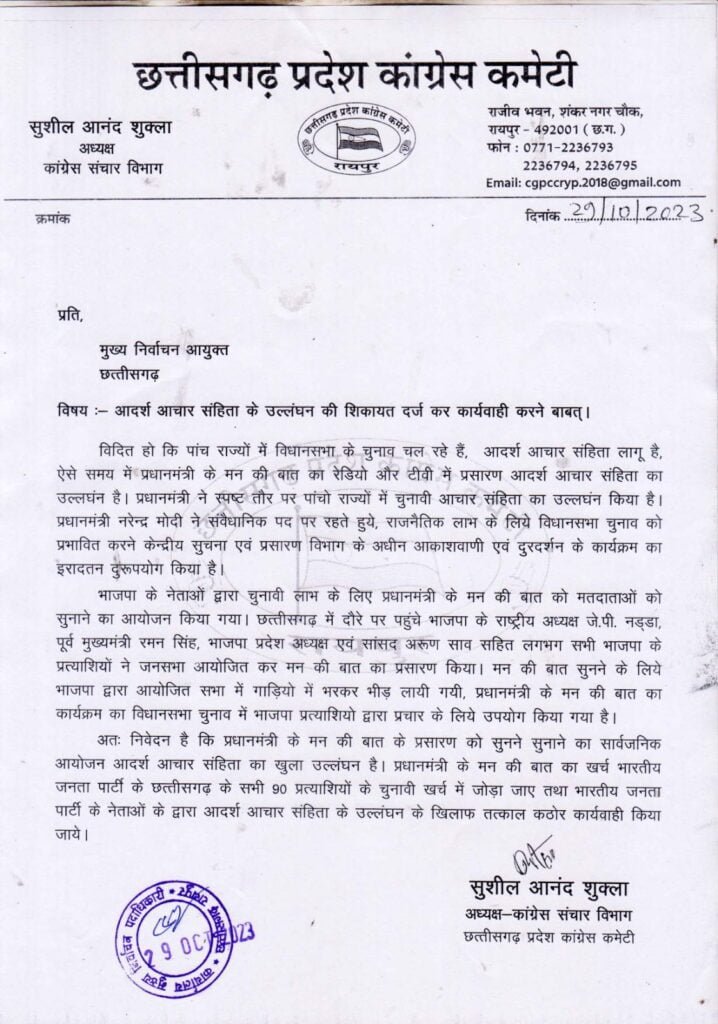 अतः निवेदन है कि प्रधानमंत्री के मन की बात के प्रसारण को सुनने सुनाने का सार्वजनिक आयोजन आदर्श आचार संहिता का खुला उल्लंघन है। प्रधानमंत्री के मन की बात कार्यक्रम के खर्चे की राशि भाजपा के प्रत्याशियो से वसूल किया जाये और भारतीय जनता पार्टी के छत्तीसगढ़ के सभी 90 प्रत्याशियों के चुनावी खर्च में जोड़ा जाए तथा भारतीय जनता पार्टी के नेताओं के द्वारा आदर्श आचार संहिता के उल्लंघन के खिलाफ तत्काल कठोर कार्यवाही किया जाये। शिकायत की प्रतिलिपि केन्द्रीय चुनाव आयोग को भेजा गया है।