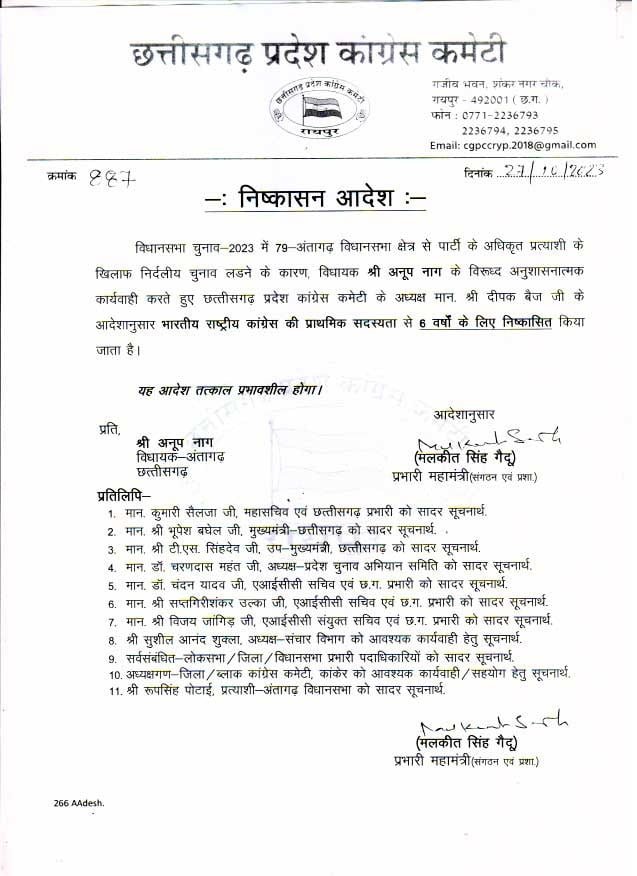 छत्तीसगढ़ में बगावत के खिलाफ कांग्रेस ने सख्ती शुरु कर दी है। पार्टी ने अंतागढ़ से निर्दलीय चुनाव लड़ रहे विधायक अनूप नाग को पार्टी से बाहर का रास्ता दिखा दिया है। पार्टी ने अनूप नाग को 6 वर्षों के लिए प्राथमिक सदस्यता से निष्कासित कर दिया है।