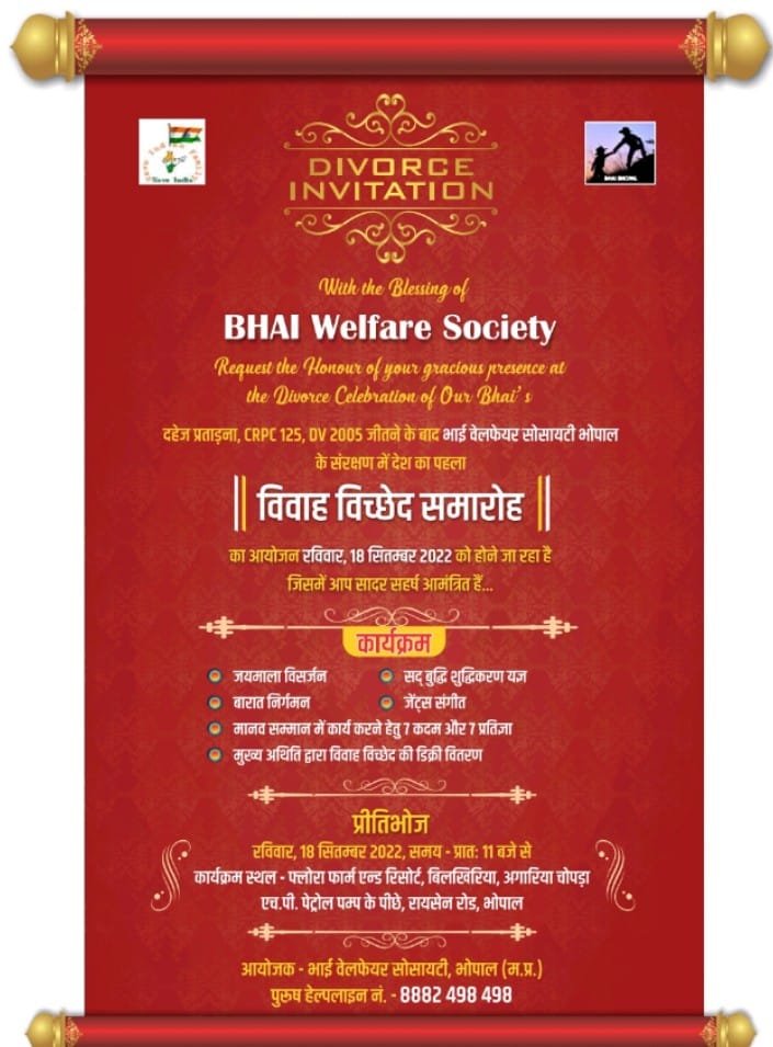 इस पार्टी का आयोजन भोपाल की ‘भाई वेलफेयर सोसाइटी’ विवाह विच्छेद समारोह नाम से आयोजित कर रही है. संस्था ने पत्नियों से अलग होने, पुरानी जिंदगी को तिलांजलि देकर नई जिंदगी की शुरुआत करने वाले पतियों के सम्मान में यह कार्यक्रम रखा गया है.