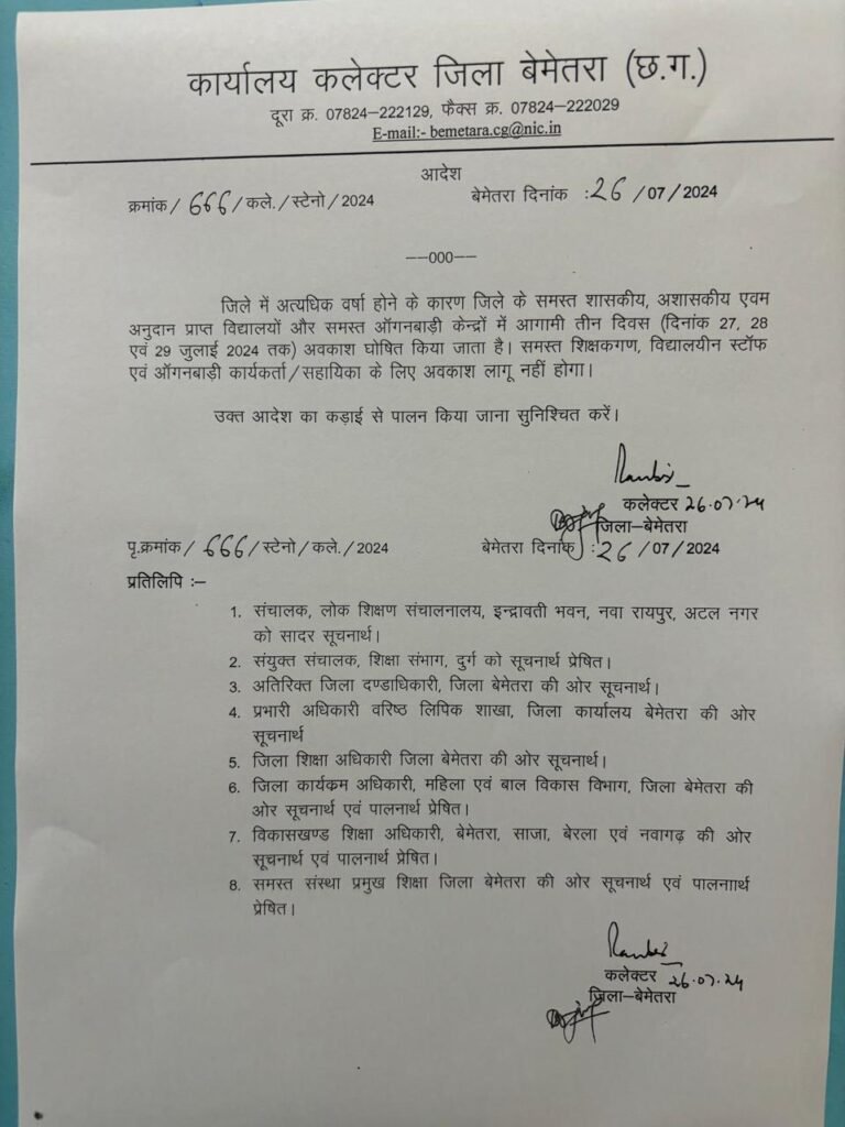 कलेक्टर के आदेश के मुताबिक सभी शासकीय, अशासकीय और अनुदान प्राप्त विद्यालयों और सभी आंगनबाड़ी केंद्र अगले तीन दिनों ( 27, 28 एवं 29 जुलाई ) तक अवकाश घोषित कर दिया है।