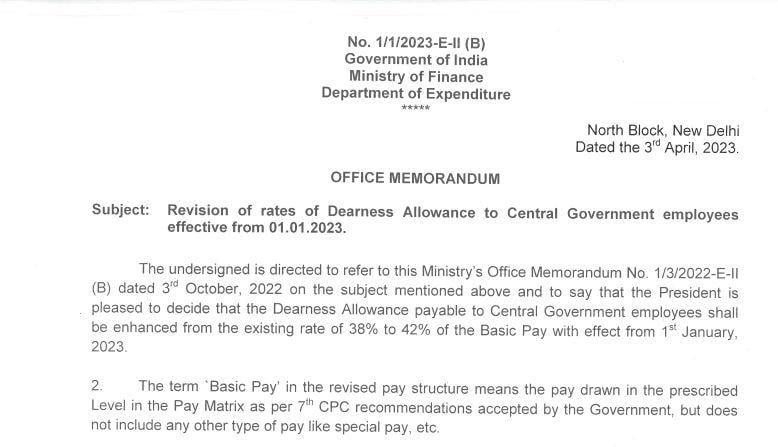 केंद्रीय कर्मचारियों के महंगाई भत्ते (DA) को मोदी सरकार ने बढ़ा दिया है। अब वित्त मंत्रालय ने बढ़े हुए डीए पर अपनी आखरी मुहर लगा दी है। वित्त मंत्रालय के एक्सपेंडिचर विभाग ने नोटिफिकेशन भी जारी कर दिा है। अब केन्द्रीय कर्मचारियों की सैलरी में बढ़ा हुए DA जुड़कर आएगा। केन्द्र सरकार ने कर्मचारियों के DA को 38 फीसदी से बढ़ाकर 42 फीसदी कर दिया है। DA में यह बढ़ोत्तरी जनवरी 2023 से जून 2023 तक के लिए किया गया है।