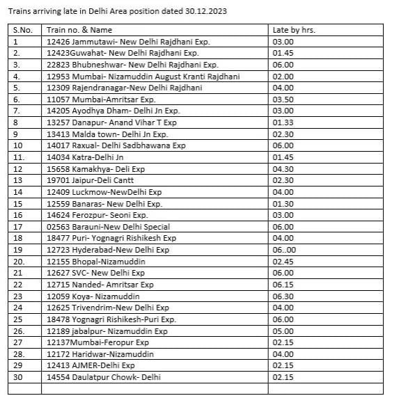 घने कोहरे की वजह से बुधवार को दिल्ली से 100 और गुरुवार को 58 फ्लाइट्स को डायवर्ट किया गया था। ऐसा ही कुछ हाल ट्रेनों का भी है, दिल्ली से देश भर के शहरों के लिए चलने वाली ट्रेनें घंटों लेट चल रही है। कई ट्रेनों को रद्द कर दिया जा रहा है। अचानक ट्रेनों के रद्द होने से यात्रियों को काफी परेशानियों का सामना करना पड़ रहा है। 30 दिसंबर को दिल्ली से चलने वाली 30 ट्रेनें देर से चल रही है।