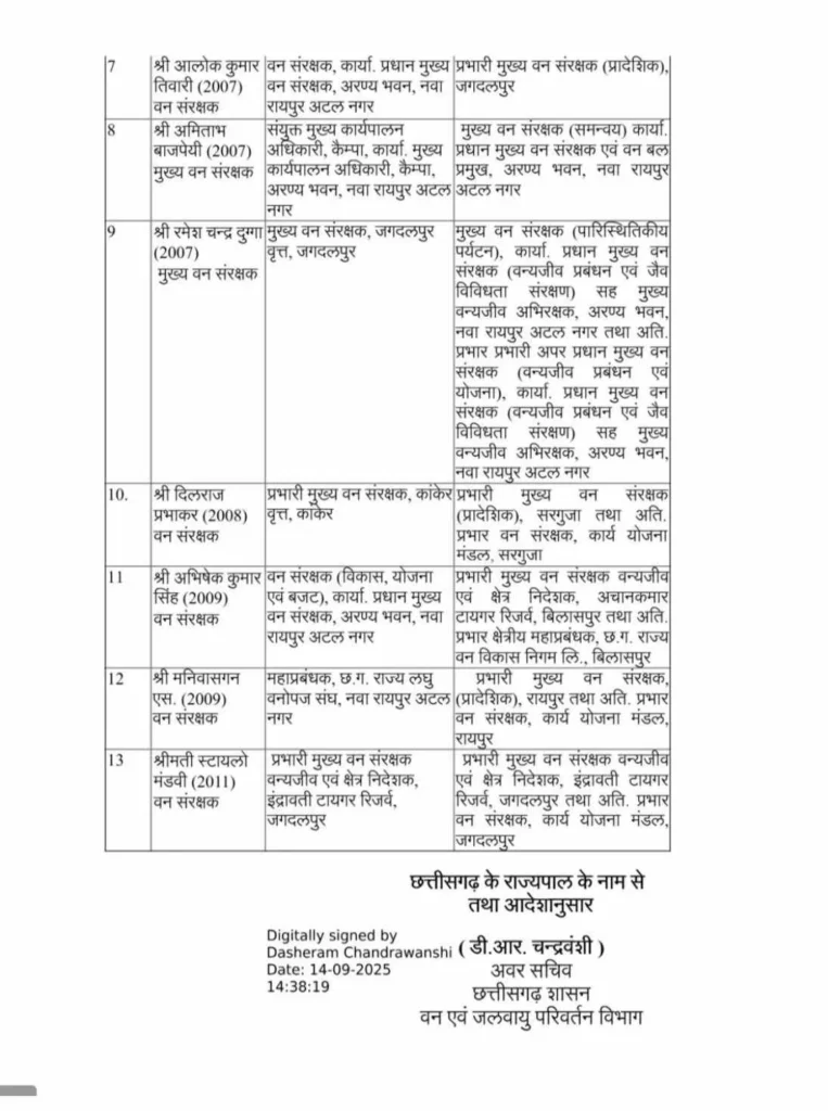 15/09/2025 Transfer: अब इस विभाग में बड़े पैमाने पर तबादला, कई बड़े अफसर हुए इधर से उधर, देखिए लिस्ट Admin September 26, 2022 छत्तीसगढ़ में राज्य सरकार ने वन विभाग में पदस्थ कई बड़े अफसरों का तबादला किया है। एक दर्जन से ज्यादा मुख्य वन संरक्षक और वन संरक्षक शामिल हैं।देखिए लिस्ट Related News: भूपेश कैबिनेट की बैठक में ट्रांसफर पर लिया गया यह निर्णय, पढ़ें पूरी खबर… चेस ओलंपियाड की मशाल पहुंची राजधानी, सीएम के साथ खेल मंत्री ने किया स्वागत ‘सोनिया गांधी को धक्के मारकर इटली भेजो’, महिला सांसद रेणुका सिंह के बिगड़े बोल