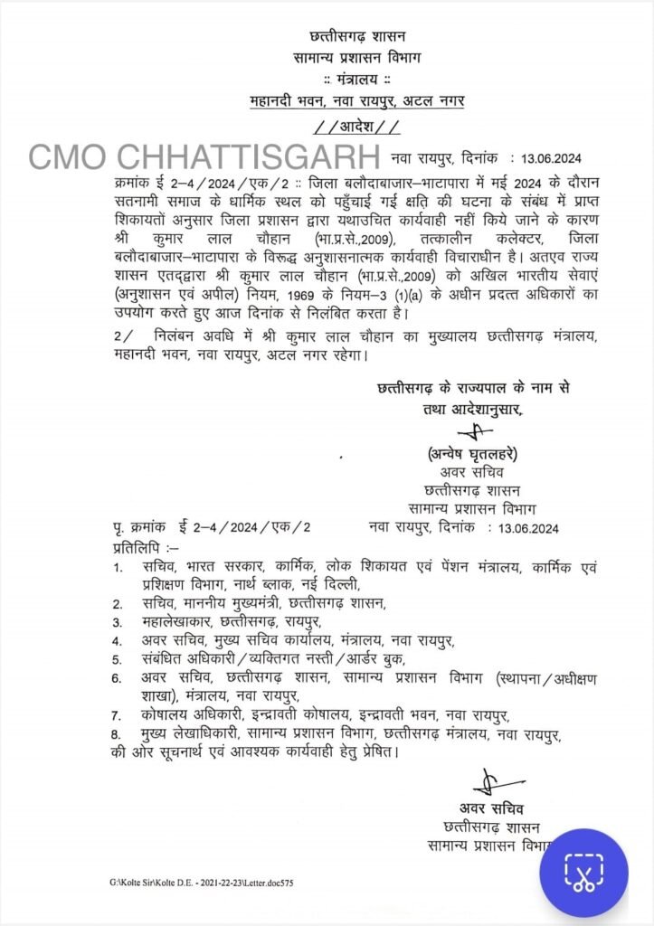 छत्तीसगढ़ के बलौदाबाजार जिले में हुई हिंसा के मामले में विष्णुदेव साय सरकार ने बड़ी कार्रवाई करते हुए तत्कालीन कलेक्टर केएल चौहान और एसपी सदानंद कुमार को निलंबित कर दिया है। इससे दो दिन पहले सरकार ने कार्रवाई करते हुए दोनों अधिकारियों को जिला मुख्यालय से हटा दिया था।