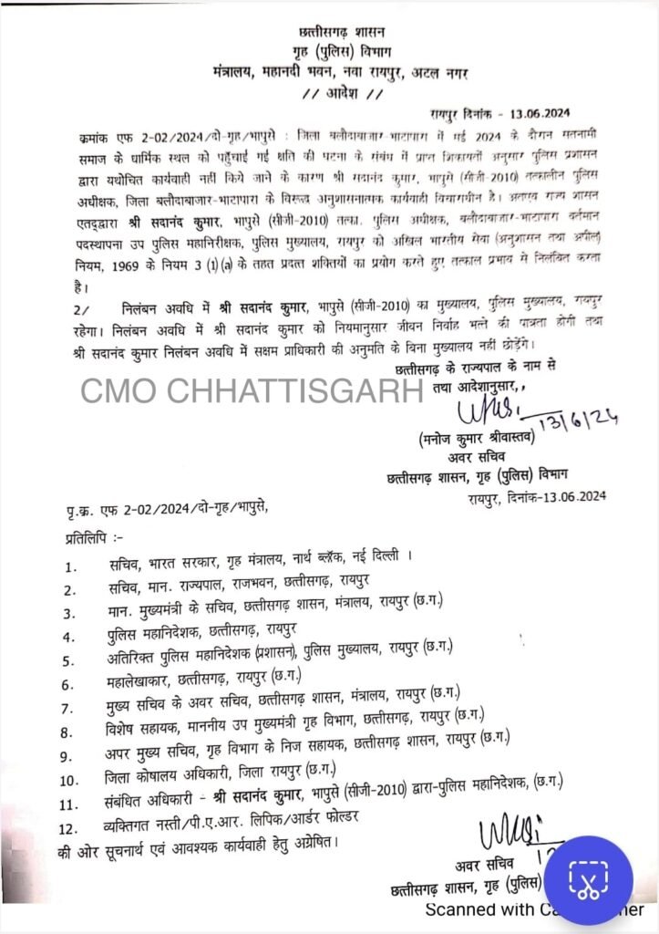 छत्तीसगढ़ के बलौदाबाजार जिले में हुई हिंसा के मामले में विष्णुदेव साय सरकार ने बड़ी कार्रवाई करते हुए तत्कालीन कलेक्टर केएल चौहान और एसपी सदानंद कुमार को निलंबित कर दिया है। इससे दो दिन पहले सरकार ने कार्रवाई करते हुए दोनों अधिकारियों को जिला मुख्यालय से हटा दिया था।