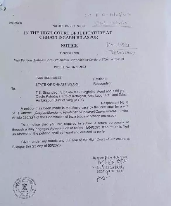 मामले में हाईकोर्ट की जस्टिस गौतम भादुड़ी और जस्टिस एनके चंद्रवंशी की बेंच ने याचिका पर सुनवाई करते हुए टीएस सिंहदेव को नोटिस जारी किया है। नोटिस में कोर्ट ने सिंहदेव को व्यक्तिगत रुप से या फिर अधिवक्ता के माध्यम से 11 अप्रैल तक अपना जवाब प्रस्तुत करने का निर्देश दिया गया है। इसके साथ ही कोर्ट ने नोटिस में कहा है कि अगर तय समय सीमा में जवाब प्रस्तुत नहीं किया गया तो मामले में हाईकोर्ट याचिका की सुनवाई करते हुए उस पर एकतरफा फैसला लिया जाएगा।