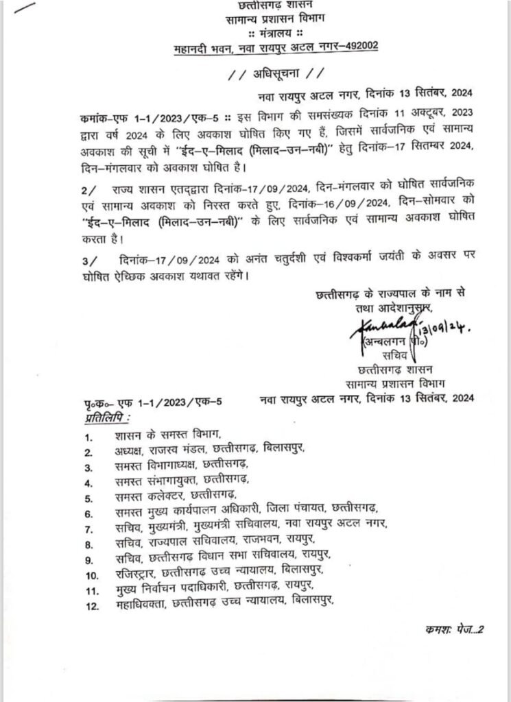छत्तीसगढ़ सरकार ने 16 सितंबर को ‘ईद-ए-मिलाद’ (मिलाद-उन-नबी) के अवसर पर राज्य में सार्वजनिक और सामान्य अवकाश घोषित किया है। इसी के साथ ही सरकार ने 17 सितंबर को अनंत चतुर्दशी और विश्वकर्मा जयंती के अवसर पर ऐच्छिक अवकाश घोषित किया है। इसके पहले 17 सितंबर को ‘ईद-ए-मिलाद’ (मिलाद-उन-नबी) पर अवकाश घोषित किया गया था।