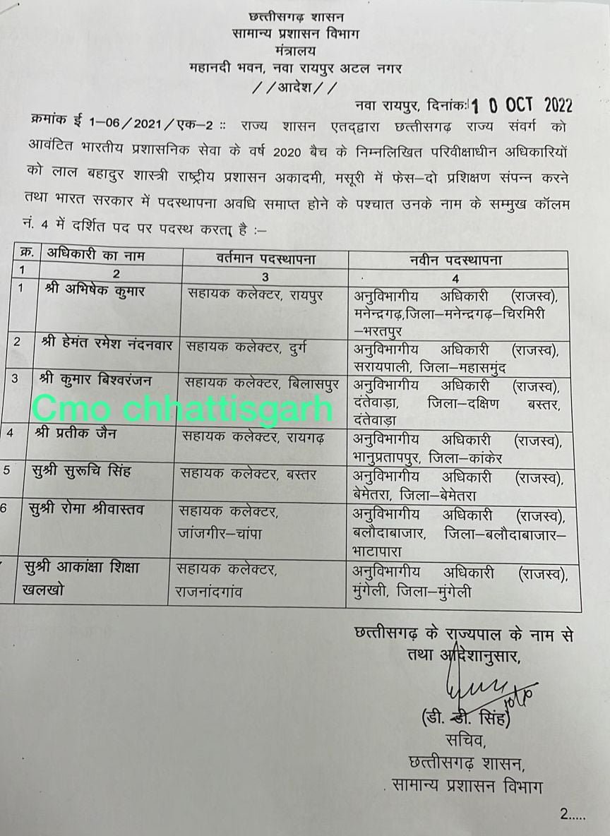 IAS BREAKING : 7 नए IAS अधिकारियों की नवीन पदस्थापना, देखिए सूची