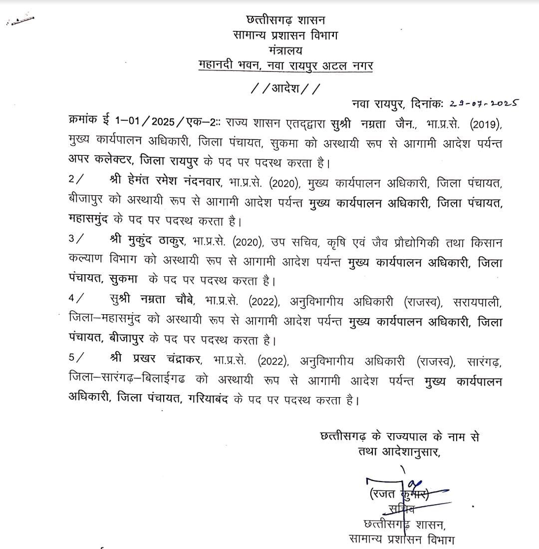 मुकुंद ठाकुर को सुकमा जिला पंचायत का सीईओ बनाया गया है। नम्रता चौबे को एसडीएम सरायपाली से बीजापुर जिला पंचायत सीईओ की जिम्मेदारी दी गई है। वहीं प्रखर चंद्राकर को एसडीएम सरायपाली से जिला पंचायत सीईओ गरियाबंद के पद पर पदस्थ किया गया है।