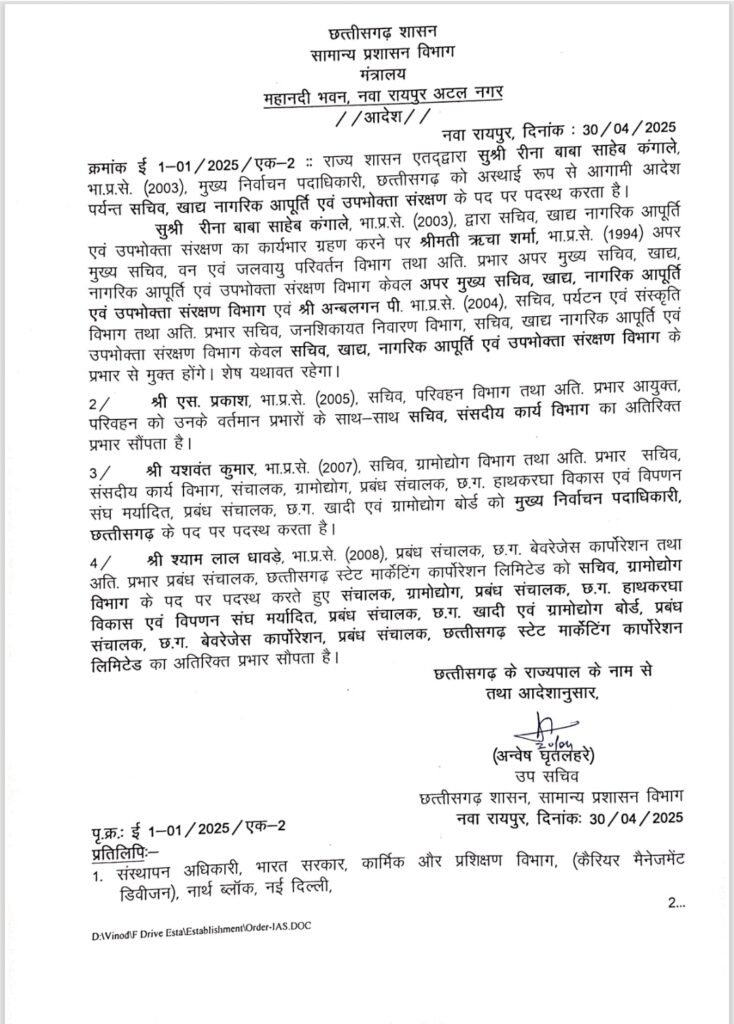 30/04/2025 IAS Transfer: छत्तीसगढ़ में IAS अफसरों का तबादला, देखिए लिस्ट Admin September 26, 2022 छत्तीसगढ़ में राज्य सरकार ने आईएएस अफसरों के प्रभार में बदलाव किया हैं।देखिए लिस्ट Related News: पूर्व सीएम भूपेश बघेल को हाईकोर्ट का नोटिस, खतरे में विधायकी! ये है मामला Police Transfer: पुलिस विभाग में बड़े पैमाने पर तबादला, 74 कर्मियों को किया इधर से उधर अडानी से जंगल बचाने आखिरकार ग्रामीणों ने उठाया तीर-धनुष, TI सहित 6 पुलिसकर्मी घायल.. हसदेव अरण्य में पेड़ कटाई का विरोध हुआ हिंसक