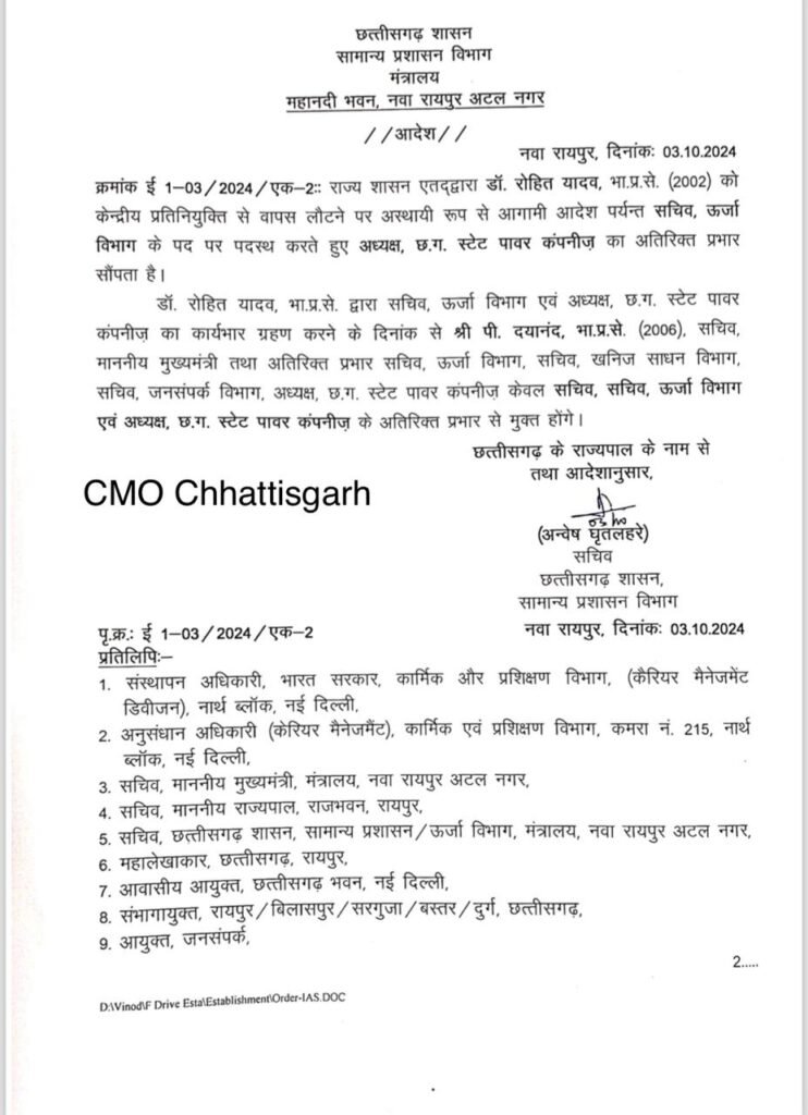 केंद्रीय प्रतिनियुक्ति से लौटे भारतीय प्रशासनिक सेवा (IAS) के अफसर रोहित यादव को सरकार ने ऊर्जा विभाग के सचिव की जिम्मेदारी दी है। इसके साथ ही सरकार ने उन्हें अध्यक्ष छत्तीसगढ़ स्टेट पावर कंपनीज का अतिरिक्त प्रभार भी सौंपा है।