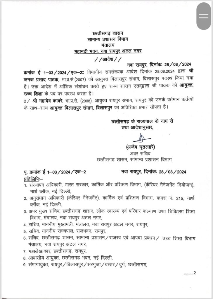 दरअसल सरकार ने बिलासपुर संभागायुक्त के पद से आईएएस नीलम एक्का को हटाकर उनकी जगह जेपी पाठक को जिम्मेदारी सौंपी थी। लेकिन रात 11 बजे सरकार ने अपने आदेश में बदलाव करते हुए रायपुर संभाग आयुक्त महादेव कांवरे को बिलासपुर संभाग आयुक्त की भी जिम्मेदारी सौंप दी।