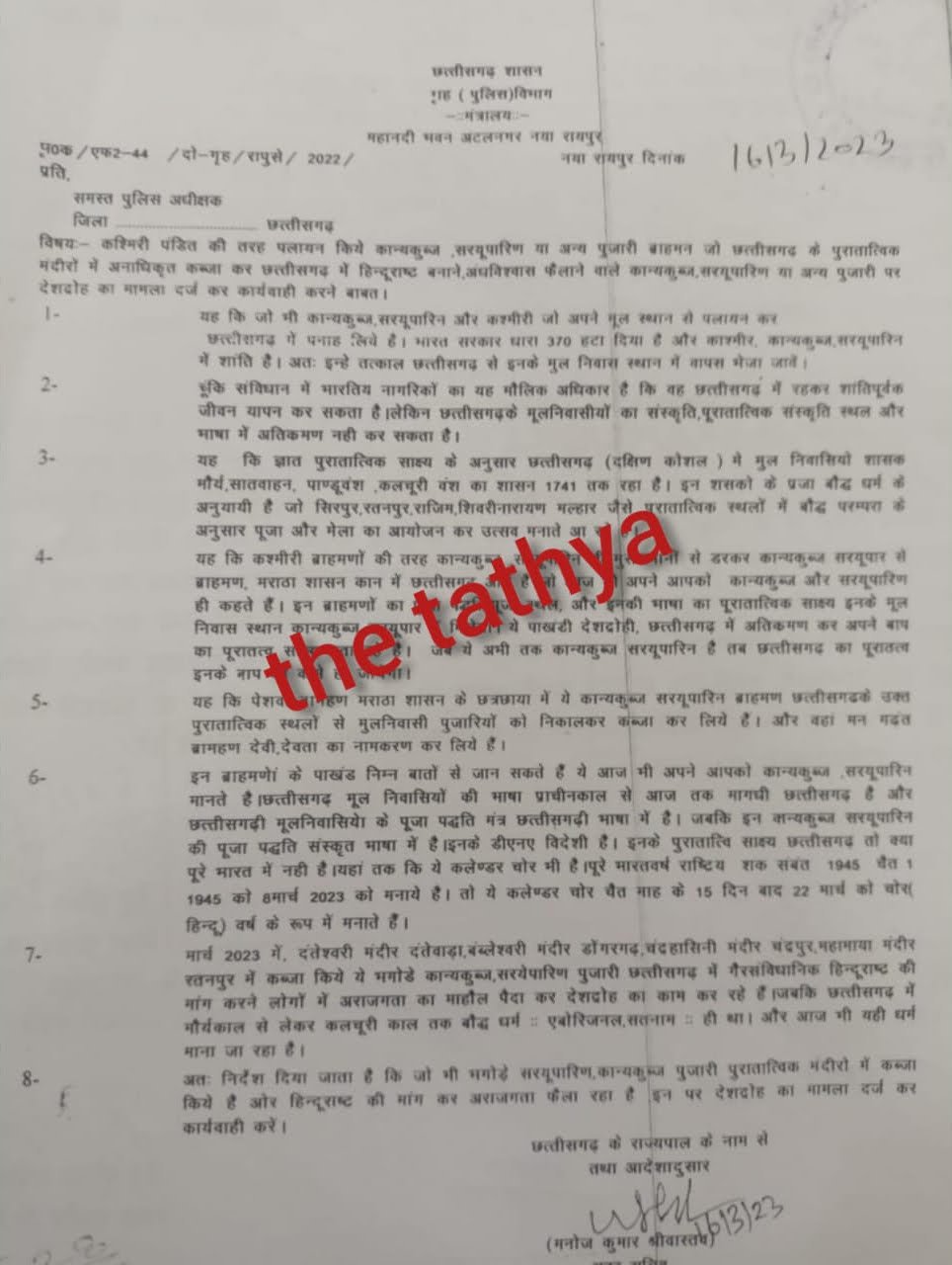 फर्जी आदेश जारी हुआ है उसमें ब्राह्मणों को टारगेट किया गया है, उन्हें पाखंडी और देशद्रोही बताया गया है। इसके साथ ही ओकहा गया कि भारत सरकार ने धारा 370 हटा दी है। जिसके बाद शांति है। इसलिए कान्यकुब्ज, सरयूपारिण और कश्मीरी जो अपने मूल स्थान से पलायन कर छत्तीसगढ़ में पनाह लिए हैं उन्हें उनके मूल स्थाना में वापस भेजा जाए। इसके साथ ही इस फर्जी आदेश में ब्राह्मणों को विदेशी डीएनए का बताया गया है। सोशल मीडिया में वायरल हो रहा ये फर्जी आदेश 16 मार्च 2023 को जारी हुआ था।