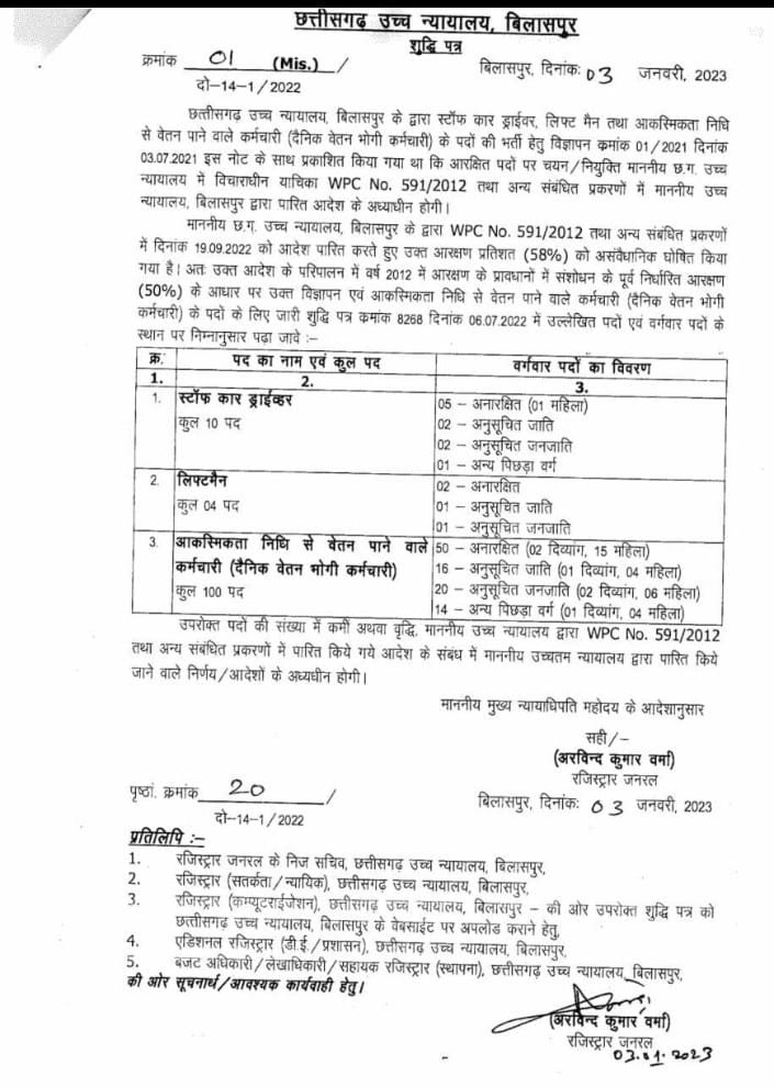 CG हाईकोर्ट में पुराने आरक्षण के आधार पर 114 पदों पर होगी भर्ती, रजिस्ट्रार ने जारी किया शुद्धिपत्र