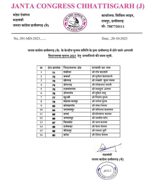 छत्तीसगढ़ विधानसभा चुनाव के लिए अब जनता कांग्रेस छत्तीसगढ़ (जे) ने भी अपने प्रत्याशियों का ऐलान कर दिया है। जेसीसीजे ने पहले चरण की 20 सीटों पर 7 नवंबर को होने वाले चुनाव के लिए 16 नामों की पहली सूची जारी की है।