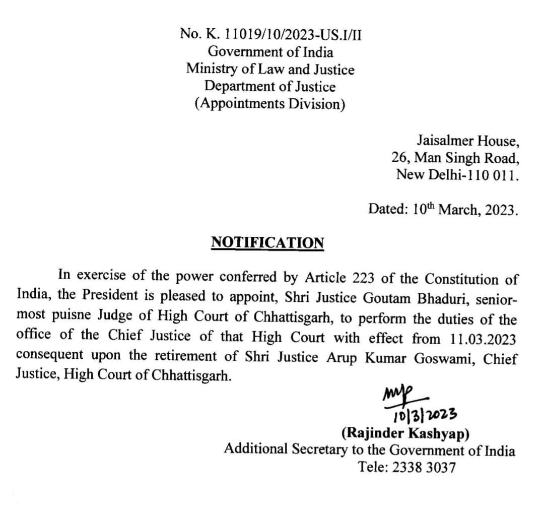 10/03/2023 BREAKING: जस्टिस गौतम भादुड़ी होंगे हाईकोर्ट के कार्यवाहक चीफ जस्टिस, अधिसूचना जारी Admin September 26, 2022 छत्तीसगढ़ हाईकोर्ट के चीफ जस्टिस अरुप कुमार गोस्वामी आज रिटायर हो रहे हैं। उनकी जगह अब जस्टिस गौतम भादुड़ी हाईकोर्ट के कार्यवाहक चीफ जस्टिस होंगे। इसे लेकर अधिसूचना जारी कर दी गई है। Related News: नोटबंदी पर सुप्रीम कोर्ट का आया बड़ा फैसला, जानिये क्या कहा बड़ी खबर: CG PSC-2022 की आगामी परीक्षा के परिणामों पर हाईकोर्ट ने लगाई रोक, आयोग को दिए ये निर्देश, पढ़िए पूरी खबर CG आरक्षण: सुप्रीम कोर्ट ने 58 % आरक्षण पर लगी रोक हटाई, भर्ती प्रमोशन शुरु करने के दिए निर्देश