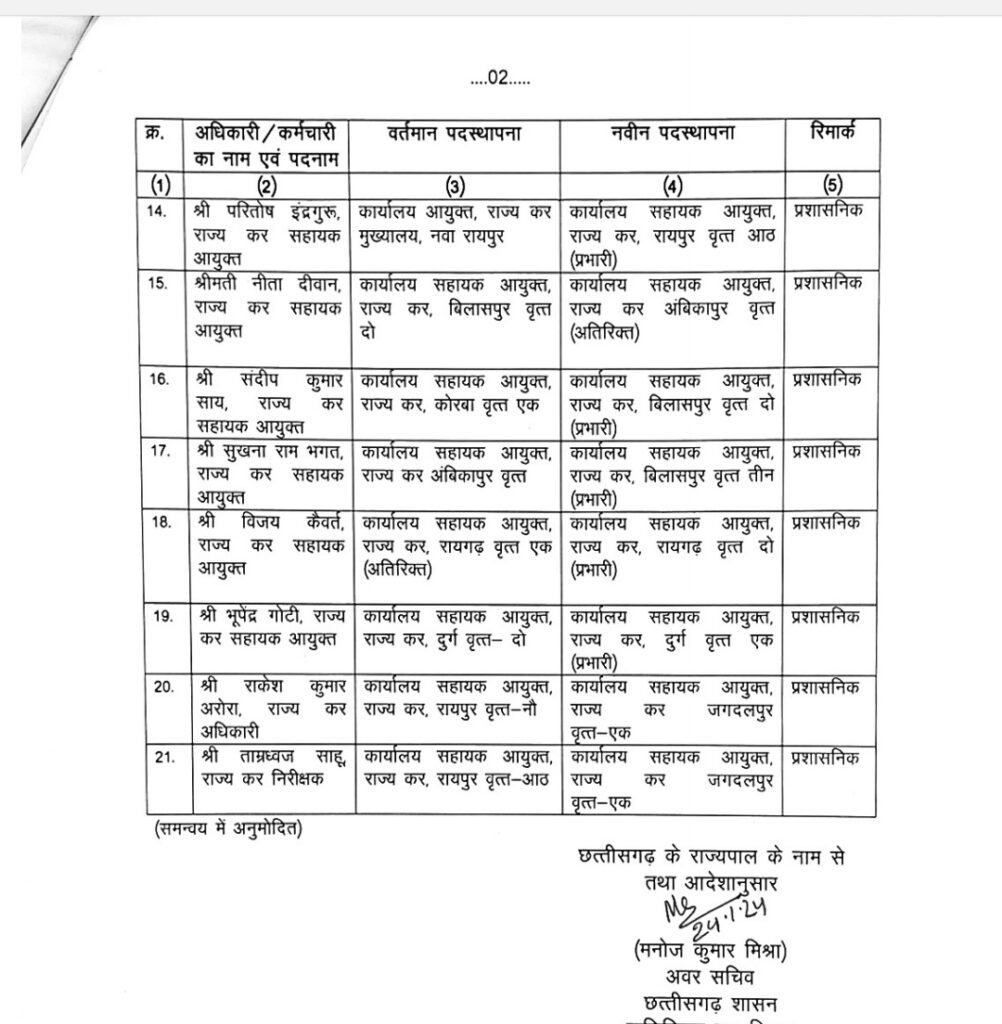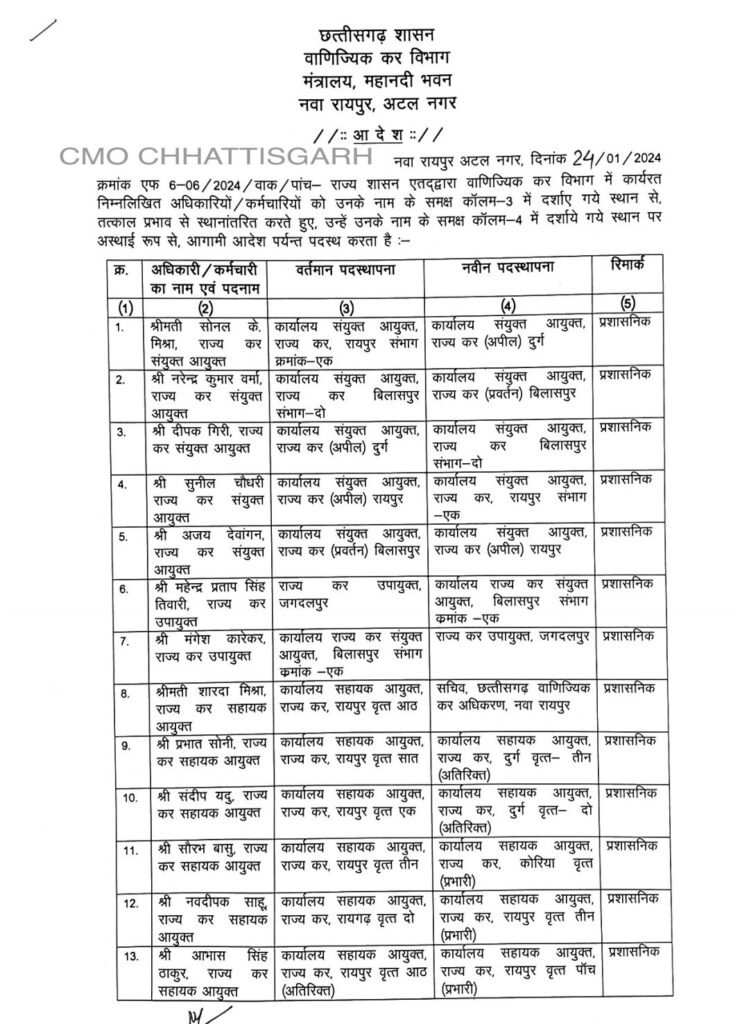 रायपुर। वाणिज्यिक कर विभाग के अधिकारियों/कर्मचारियों के स्थानांतरण आदेश जारी। 21 अधिकारी/कर्मचारी हुए स्थानांतरित। वाणिज्यिक कर-जी.एस.टी. विभाग में पदस्थ संयक्त आयुक्त राज्य कर के 05, राज्य कर उपायुक्त के 02, सहायक आयुक्त राज्य कर के 12, एक राज्य कर अधिकारी एवं एक निरीक्षक राज्य कर सहित 21 अधिकारी/कर्मचारियों के आदेश राज्य कर आयुक्त कार्यालय ने जारी किए हैं।