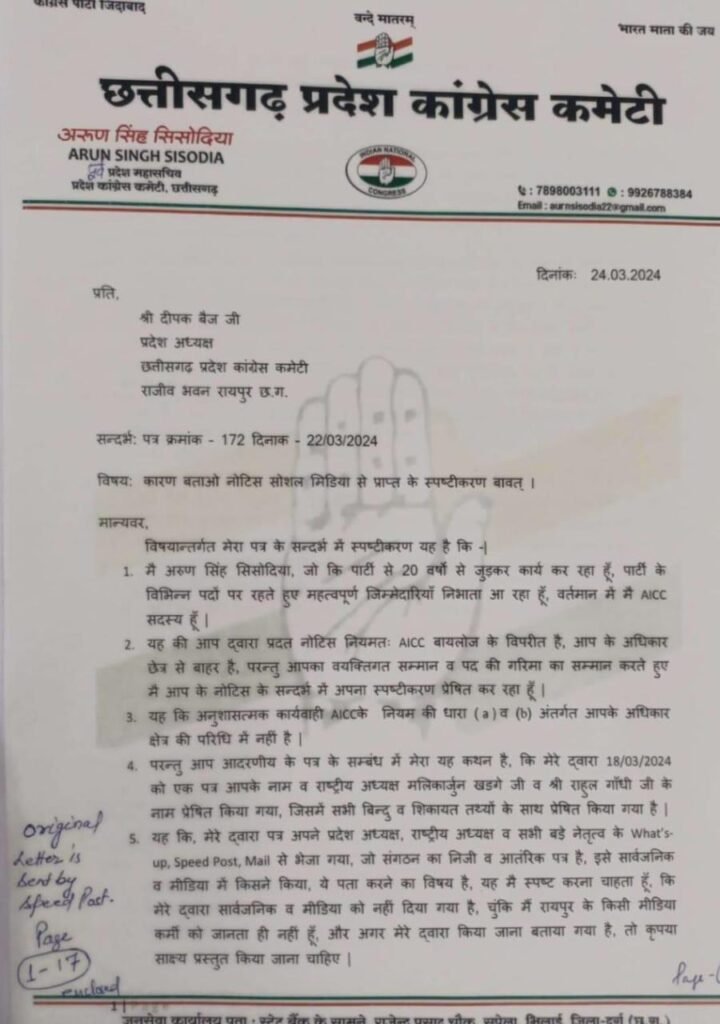 लोकसभा चुनाव के नामांकन की प्रक्रिया शुरु हो गई है। लेकिन इन सबके बीच अभी भी छत्तीसगढ़ कांग्रेस में मचा कलह थमने का नाम नहीं ले रहा है। कांग्रेस कार्यकर्ता और नेता अपनी ही पार्टी के बड़े नेताओं पर गंभीर आरोप लगा रहे हैं। पार्टी कोष में गड़बड़ी का आरोप लगाने वाले एआईसीसी सदस्य अरुण सिसोदिया ने मिले शोकॉज नोटिस का जवाब देकर एक और बम फोड़ दिया है। उन्होंने शोकॉज नोटिस का 13 बिन्दुओं में जवाब दिया है। अब एक बार फिर उनके द्वारा लिखे गए जवाब से पार्टी के भीतर हड़कंप मच गया है। सिसोदिया ने पूर्व मुख्यमंत्री भूपेश के साथ ही राम गोपाल अग्रवाल और विनोद वर्मा पर कार्रवाई की मांग की है।