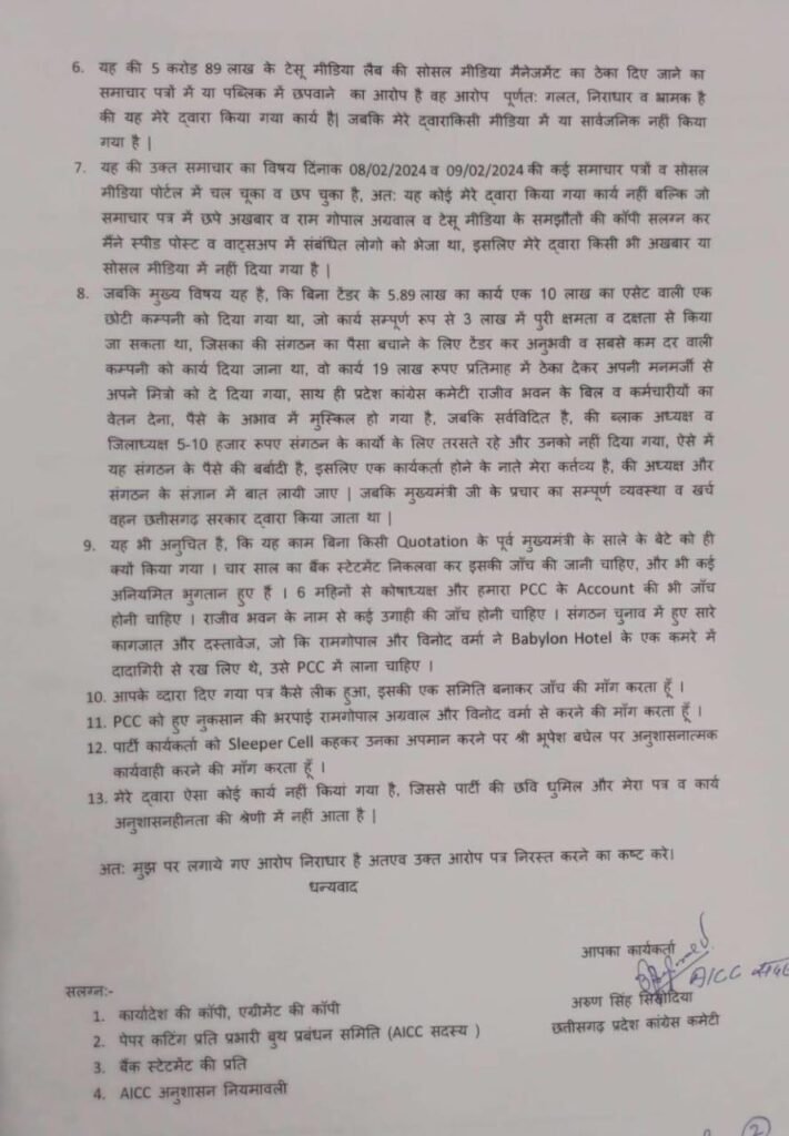 आपको बता दें अरुण सिसोदिया ने कांग्रेस कोषाध्यक्ष रामगोपाल अग्रवाल पर पार्टी फंड में गड़बड़ी करने का आरोप लगाया था। पत्र लिखकर उन्होंने कहा था, “छत्तीसगढ़ प्रदेश कांग्रेस कमेटी में कोषाध्यक्ष रामगोपाल अग्रवाल ने अपने मित्र और पूर्व मुख्यमंत्री भूपेश बघेल के राजनितिक सलाहकार विनोद वर्मा के बेटे की कंपनी टेसू मौडिया लैब गाजियाबाद को 5 करोड़ 89 लाख रुपये बिना प्रदेश अध्यक्ष मोहन मरकाम व प्रभारी महामंत्री की जानकारी और अनुमति के भुगतान किया गया है। जबकि कोषाध्यक्ष को कार्यादेश जारी करने की अनुमति नहीं है और पार्टी बायलॉज के अनुसार प्रदेश कार्यकारणी में प्रस्ताव लाकर पास करना आवश्यक है और प्रदेश अध्यक्ष के नोट शीट ऐपुवल लिया जाना जरूरी है।