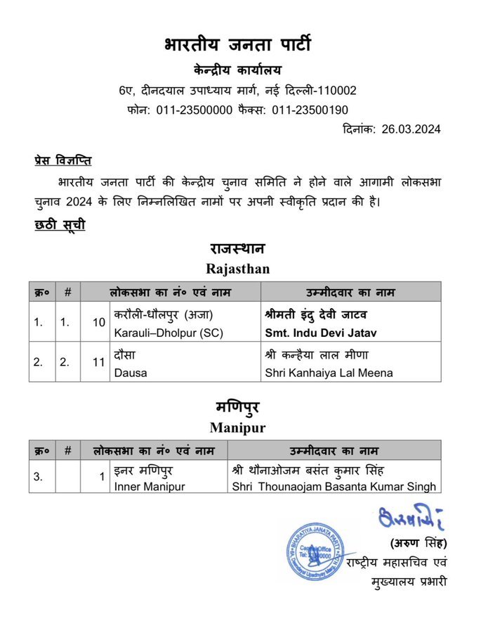 बीजेपी ने करौली धौलपुर से इंदु देवी जाटव को उम्मीदवार बनाया है। वहीं दौसा से पार्टी ने कन्हैयालाल मीणा को टिकट दिया है। जबकि इनर मणिपुर थौनाओजम बसंत कुमार सिंह को चुनावी मैदान में उतारा है।