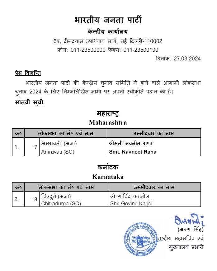 लोकसभा चुनाव 2024 के लिए बीजेपी ने बुधवार को उम्मीदवारों की 7 वीं लिस्ट जारी की। बीजेपी ने इस सूची में 2 प्रत्याशियों के नाम का ऐलान किया है। इस लिस्ट में बीजेपी ने महाराष्ट्र के अमरावती से नवनीत राणा को उम्मीदवार बनाया। वहीं कर्नाटक की चित्रदुर्गा सीट से पार्टी ने गोविंद करजोल को टिकट दिया।
