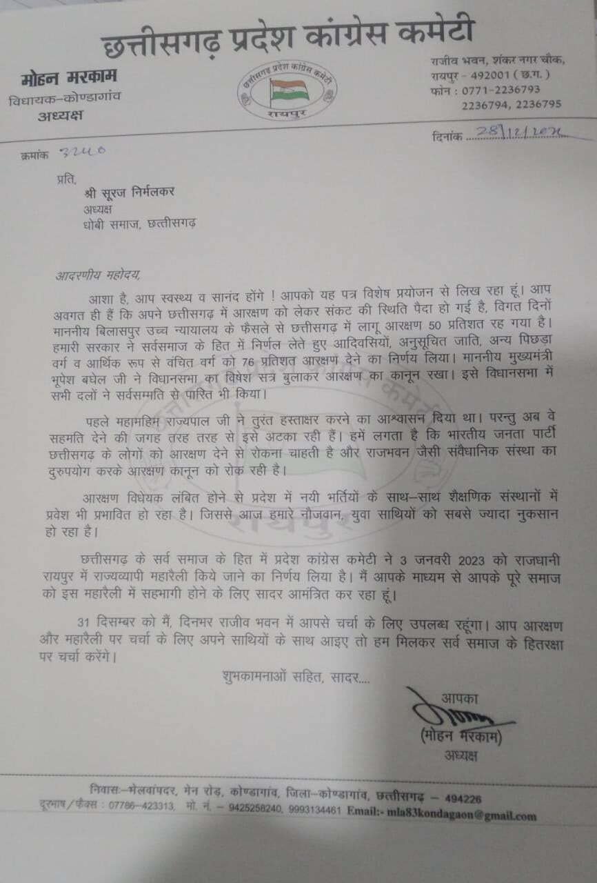छत्तीसगढ़ में आरक्षण पर सत्ता पक्ष और राजभवन के बीच तकरार जारी है। अब सत्ताधारी दल ने आरक्षण को लेकर मोर्चा खोल दिया है। 3 जनवरी को कांग्रेस ने राजधानी रायपुर में महारैली का आयोजन किया है। इस रैली में शामिल होने के लिए पीसीसी अध्यक्ष मोहन मरकाम ने सभी समाज के प्रमुखों को पत्र लिखा है।