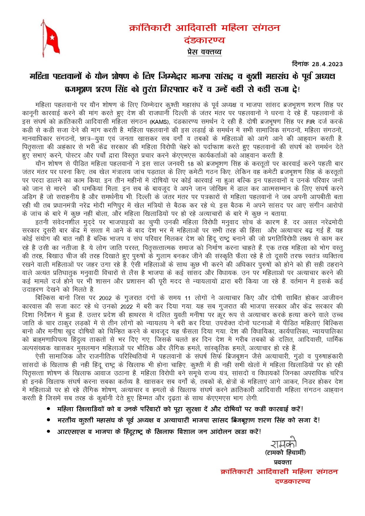 माओवादियों के क्रांतिकारी आदिवासी महिला संगठन दंडकारण्य (KAMS) के प्रवक्ता रामको हिचामी ने प्रेस विज्ञप्ति जारी की है। जिसमें उन्होंने बीजेपी सांसद बृजभूषण सिंह गिरफ्तार कर उऩ्हें कड़ी से कड़ी सजा देने की मांग की है। इसके साथ ही माओवादियों ने पहलवानों के समर्थन में सभी सामाजिक संगठनों, महिला संगठनों, मानवाधिकार संगठनों, छात्रों, युवाओं के साथ ही देश के सभी वर्गों को सामने आने का आह्वान किया है।