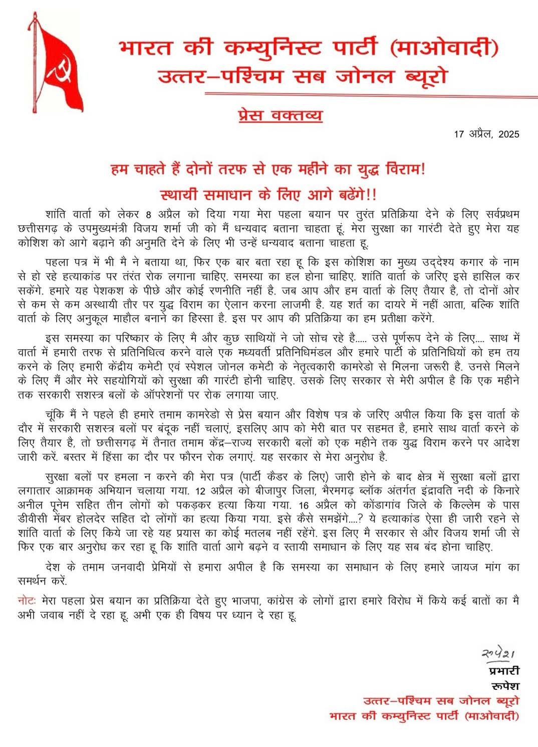 नक्सल नेता ने आगे लिखा कि वार्ता में हमारे तरफ से प्रतिनिधित्व करने वाले प्रतिनिधिमंडल का नेतृत्वकारी कामरेडों से मिलना जरुरी है। उनसे मिलने के लिए मेरे सहयोगियों को सुरक्षा की गारंटी चाहिए। इसलिए सरकार से अपील है कि एक महीने तक सरकारी सशस्त्र बलों के ऑपरेशन पर रोक लगाई जाए।