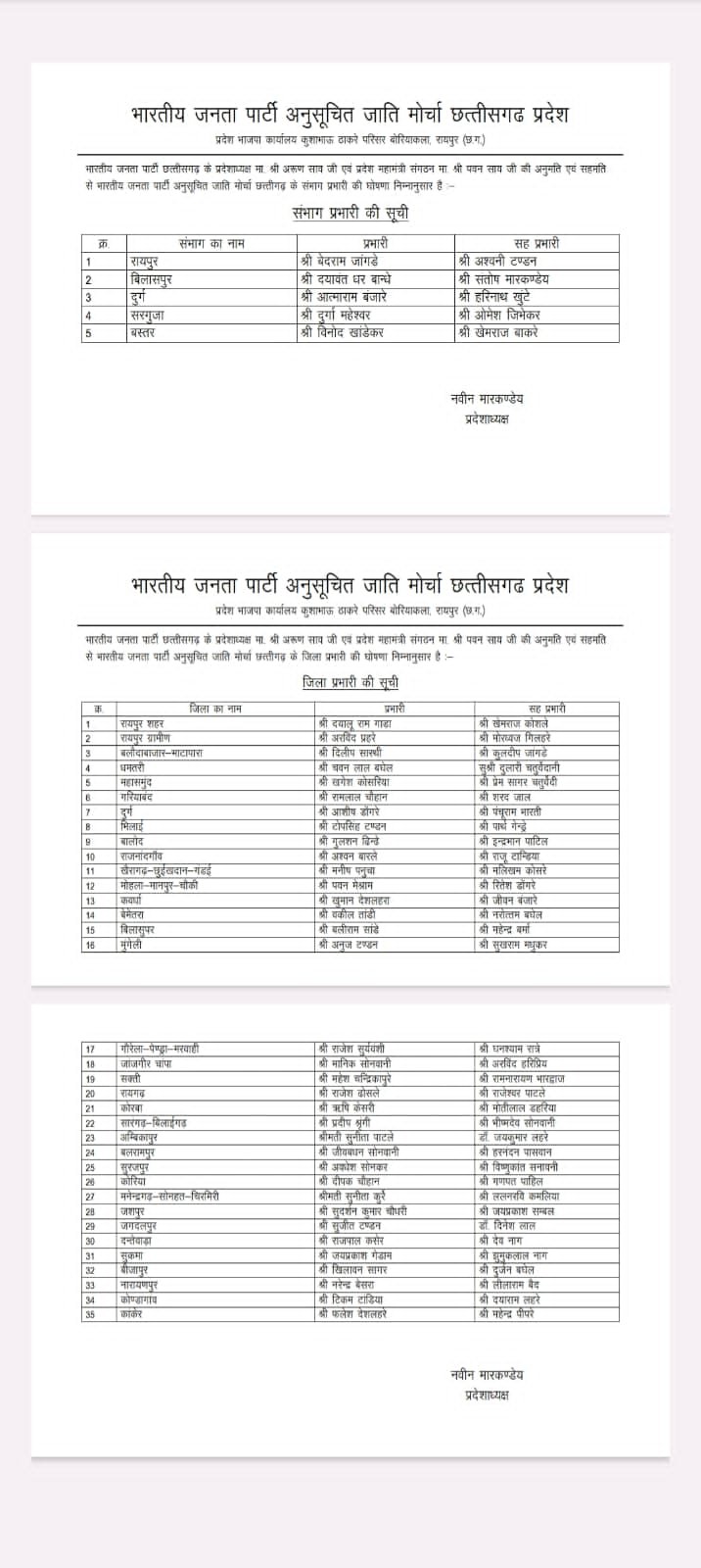 BJP में नई नियुक्तियां, SC मोर्चा के संभाग और जिला प्रभारियों की घोषणा, देखिए सूची