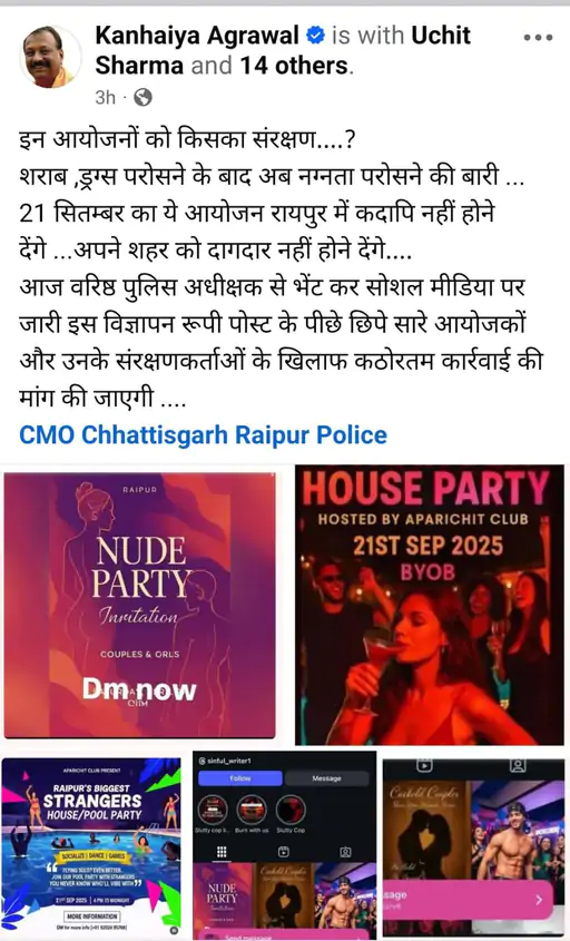 छत्तीसगढ़ की राजधानी रायपुर में ड्रग्स सिंडिकेट मामले के बाद अब न्यूड पार्टी को लेकर एक नया विवाद खड़ा हो गया है। सोशल मीडिया प्लेटफॉर्म्स पर ‘न्यूड पार्टी’, ‘स्ट्रेंजर पार्टी’ और ‘हाउस पूल पार्टी’ जैसे नामों से आयोजन के पोस्टर वायरल हो रहे हैं, जिसमें युवाओं को बिना कपड़ों के शामिल होने का निमंत्रण दिया जा रहा है। इन पोस्टर्स में 21 सितंबर को रायपुर में आयोजन होने का दावा किया गया है, साथ ही पूल पार्टी, शराब और ड्रग्स परोसने के संकेत भी दिए गए हैं। इस घटना ने समाज के विभिन्न वर्गों में आक्रोश पैदा कर दिया है, और लोग पुलिस व प्रशासन से सख्त कार्रवाई की मांग कर रहे हैं।