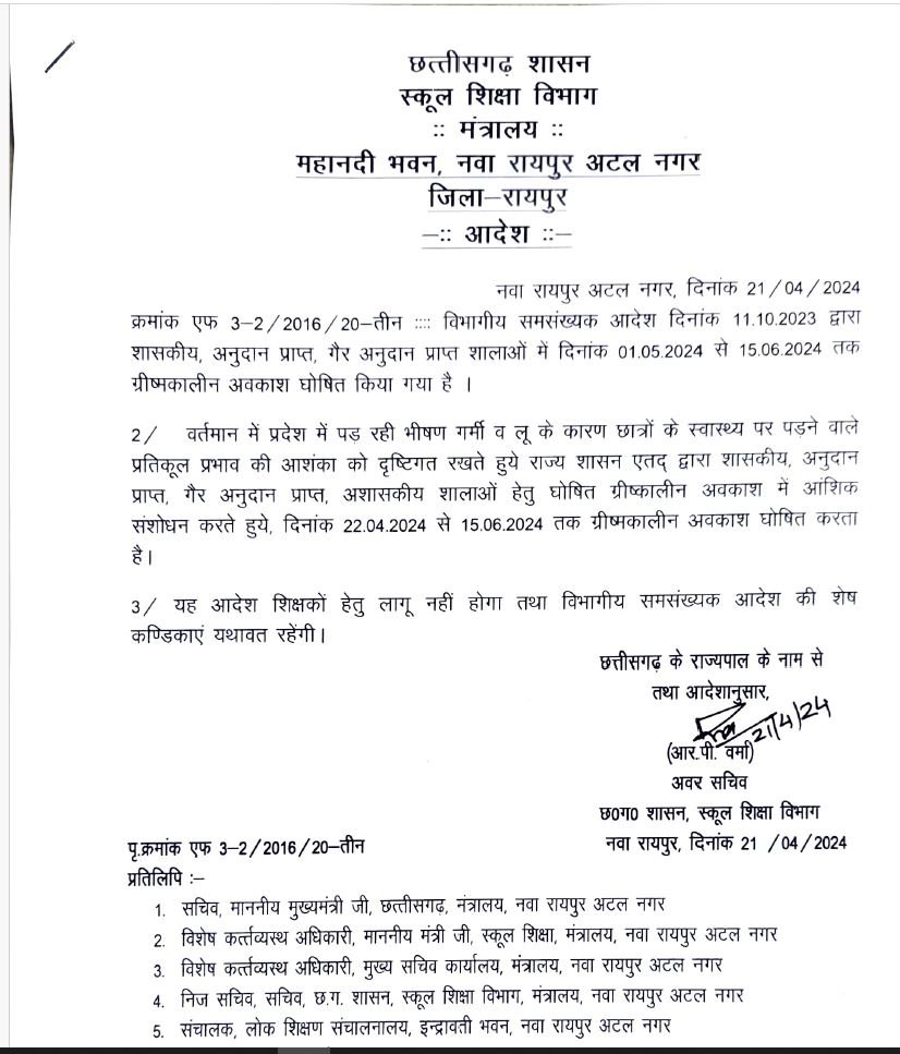 आपको बता दें छत्तीसगढ़ के कई जिले इन दिनों भीषण गर्मी और लू की चपेट में हैं। जिसे देखते हुए स्कूल शिक्षा विभाग ने सोमवार 22 अप्रैल से 15 जून तक ग्रीष्म कालीन अवकाश घोषित किया है। इससे पहले 1 मई से 15 जून तक ग्रीष्मकालीन अवकाश घोषित किया गया था, जिसमें अब संशोधन किया गया है।