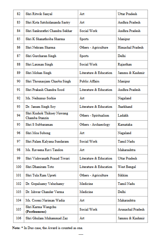 गणतंत्र दिवस की पूर्व संध्या पर सरकार ने प्रतिष्ठित पद्म पुरस्कारों का ऐलान कर दिया है। राष्ट्रपति ने 106 पद्म पुरस्कारों को प्रदान करने की मंजूरी दी है। जिसमें 6 पद्म विभूषण, 9 पद्म भूषण और 91 पद्मश्री शामिल हैं।
